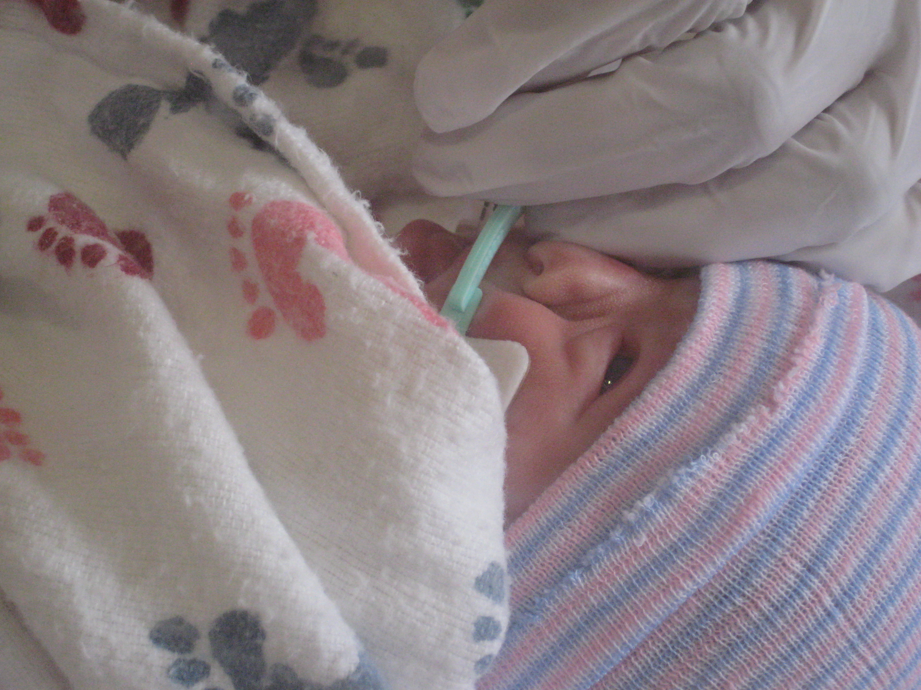 She thrived in the NICU. She wasn’t sick at all – just small! She was born at 3 lbs 15 oz, at 33 weeks and 1 day into the pregnancy. She was extubated less than 24 hours after her birth and needed no assistance breathing when that happened. Her IV came out a few days later. She’s had an NG (nasogastric) tube for a couple weeks, which is pretty standard given the difficulty that many preemies have feeding from the breast or bottle. Once her suck/swallow reflex developed, she nursed beautifully, even in spite her preemie status.